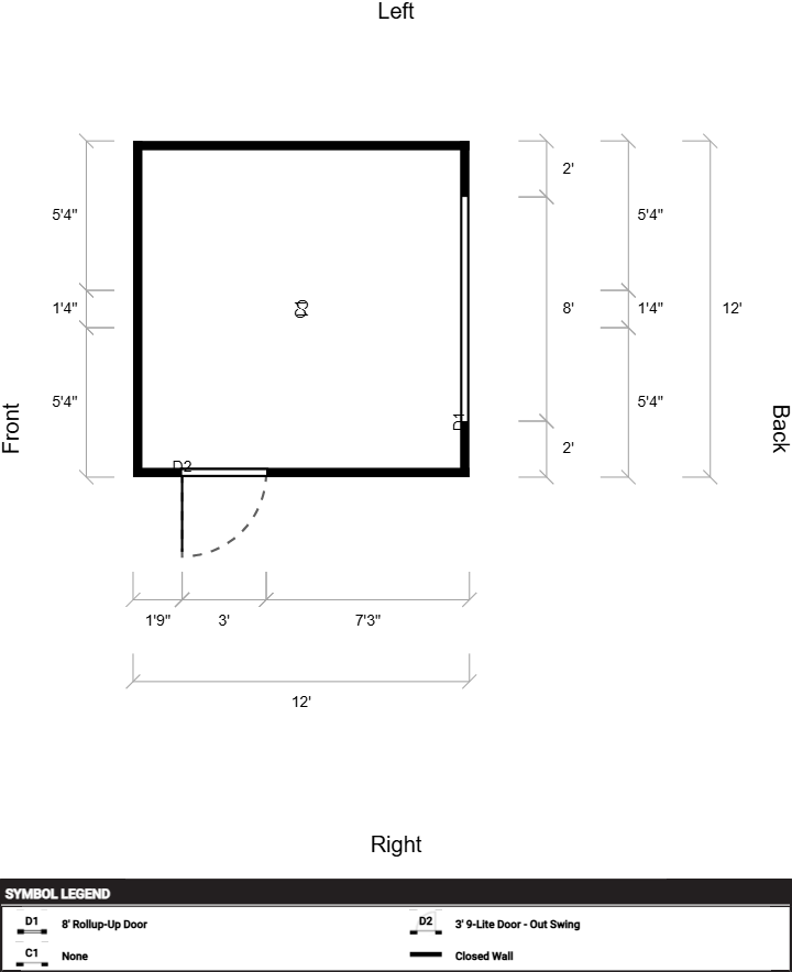 | Doors | 3' 9-Lite Door – Out Swing, Hinges Left, 8' Rollup-Up Door |