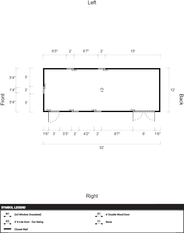 | Doors | 3' 9-Lite Door – Out Swing, Hinges Left, 6' Double Wood Door |