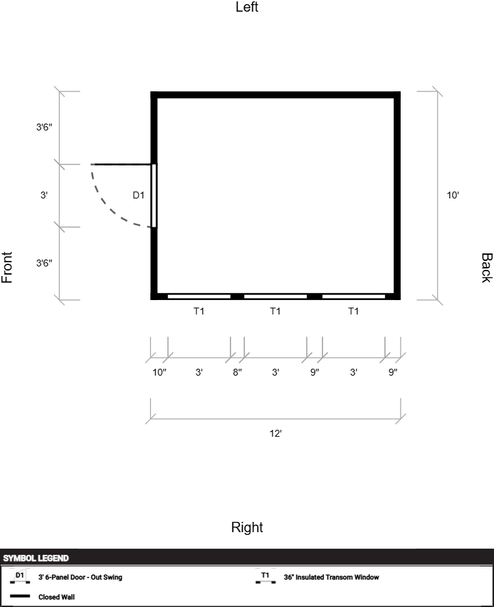 | Doors | 3' 6-Panel Door – Out Swing, Hinges Left |