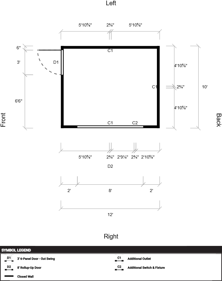 | Doors | 3' 6-Panel Door – Out Swing, Hinges Left, 8' Rollup-Up Door |