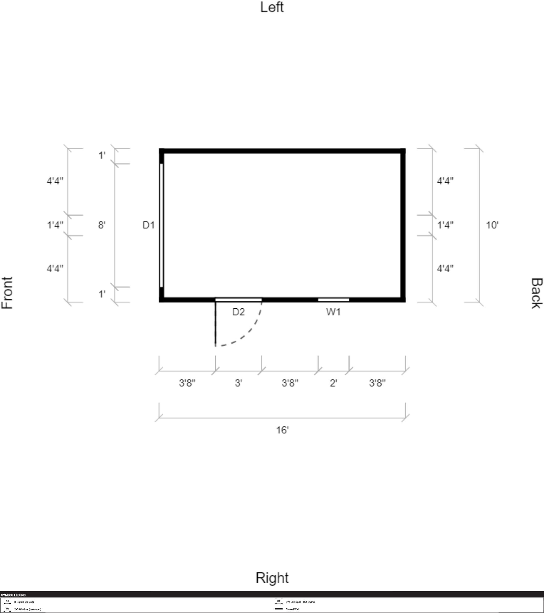 | Doors | 3' 9-Lite Door – Out Swing, Hinges Left, 8' Rollup-Up Door |