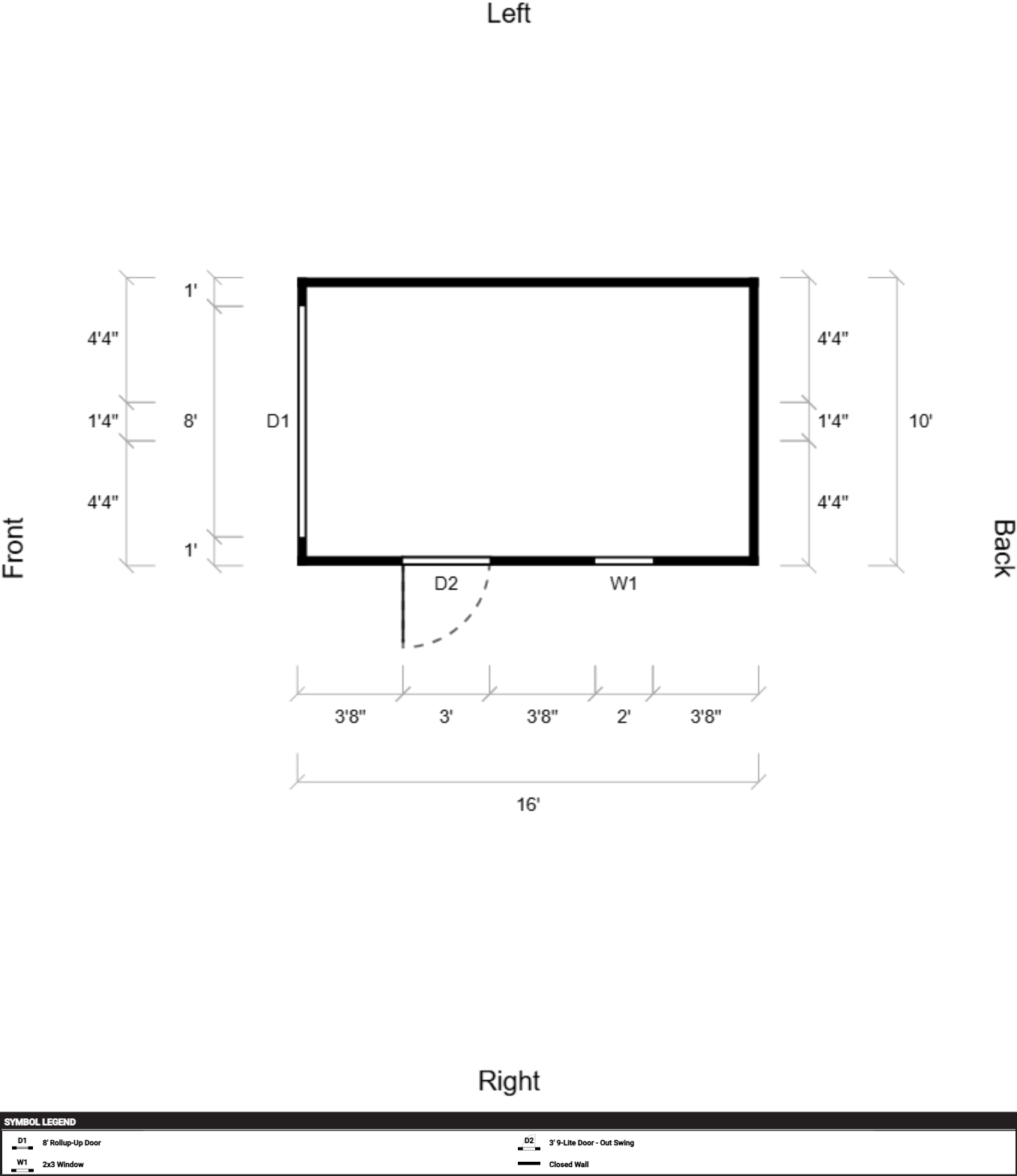 | Doors | 3' 9-Lite Door – Out Swing, Hinges Left, 8' Rollup-Up Door |
